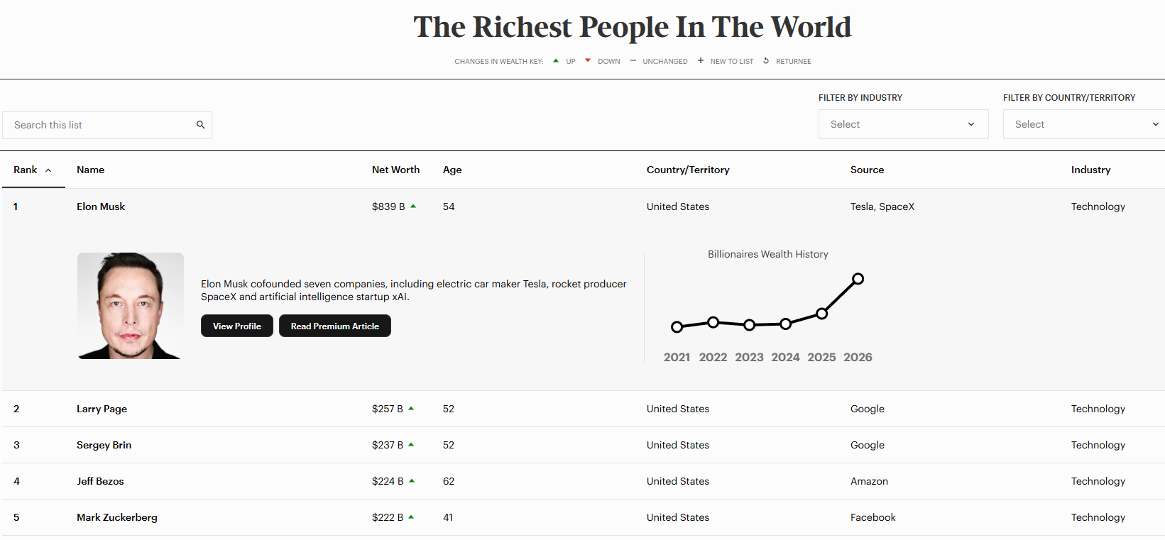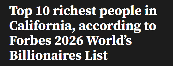 根据福布斯2026全球亿万富豪榜,加州继续在超级富豪阶层中占据主导地位,许多世界最富有的人都把加州称为家乡。