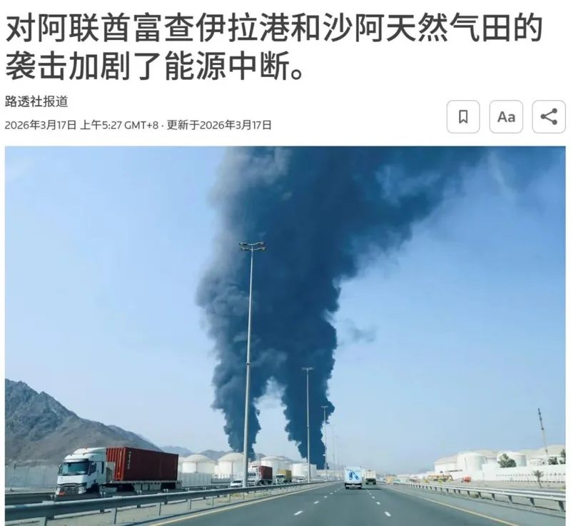 哈尔克岛是伊朗最重要的石油出海口,13号,美国轰炸了这里,却刻意没炸油库。伊朗马上还礼,炸了阿联酋现在唯一的出海口——富查伊拉港。第二条底线也破了。▼
