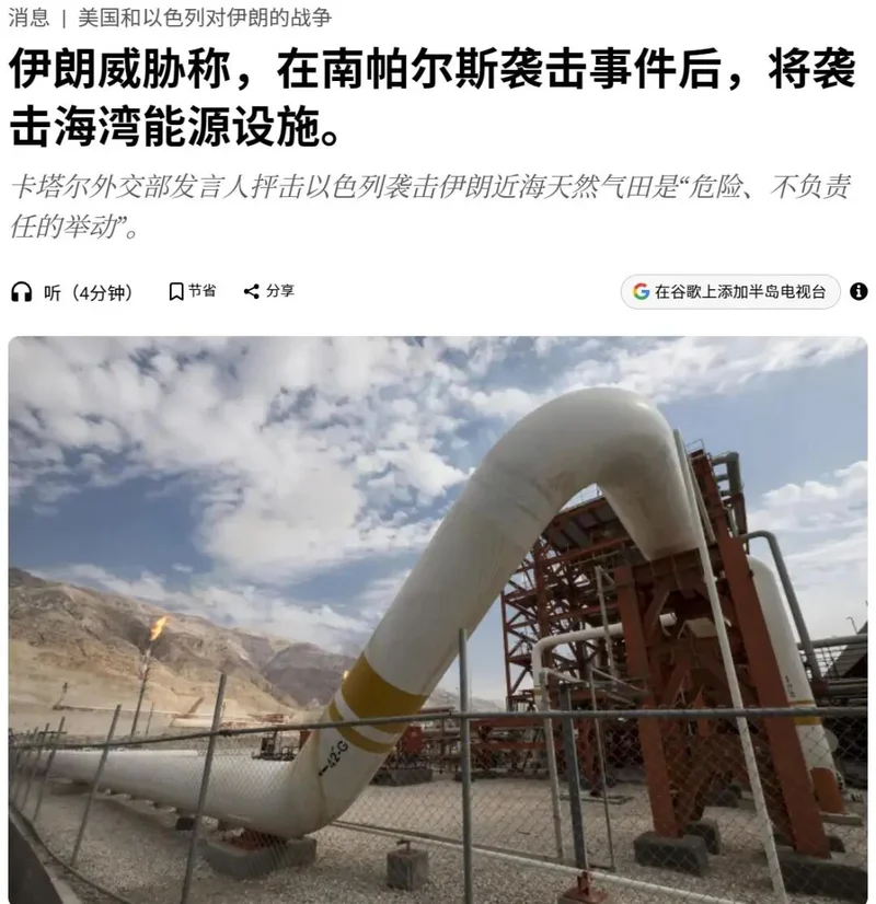 随后伊朗的最大气田——南帕尔斯气田也被炸了。伊朗随即宣布,把沙特、阿联酋、卡塔尔三国一大批油气田、石化工厂列入打击清单。▼