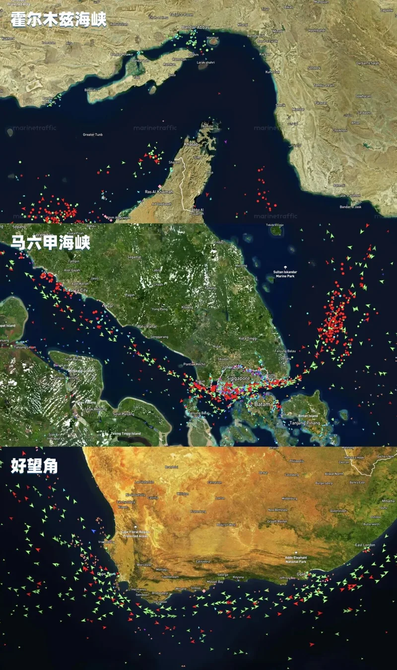 ▲图注:霍尔木兹海峡、马六甲海峡、好望角