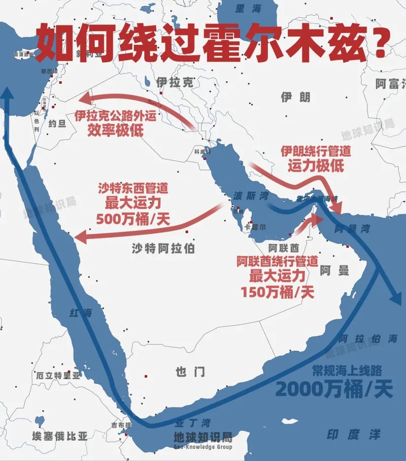 霍尔木兹一天能通过2000万桶原油,但现在海峡一封,石油爹们每天少了20亿美元(按100美元一桶算),纷纷开始想办法“绕路”——