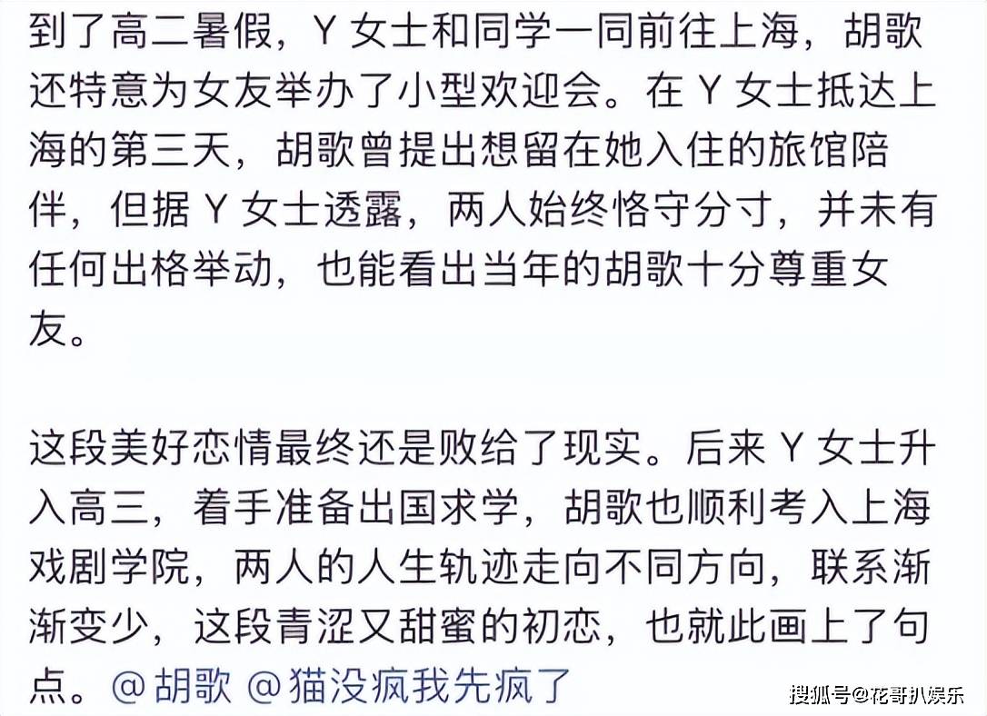 而这么深爱的两人,实际上只见过两面,高一暑假在北京初次相遇,一眼心动就确定了心意;高二暑假Y女士远赴上海,胡歌特意为她办了热闹的欢迎会。相处期间两人同住旅馆,却始终保持分寸,没有越过界限,全程尊重又克制,说实话在渣男遍地走的娱乐圈,这样的男人真的很难得了。后来Y女士准备出国留学,胡歌顺利考入上海戏剧学院,不同的人生轨迹让这段感情慢慢淡去,没有争吵没有纠缠,和平收场成了彼此青春里的美好回忆。