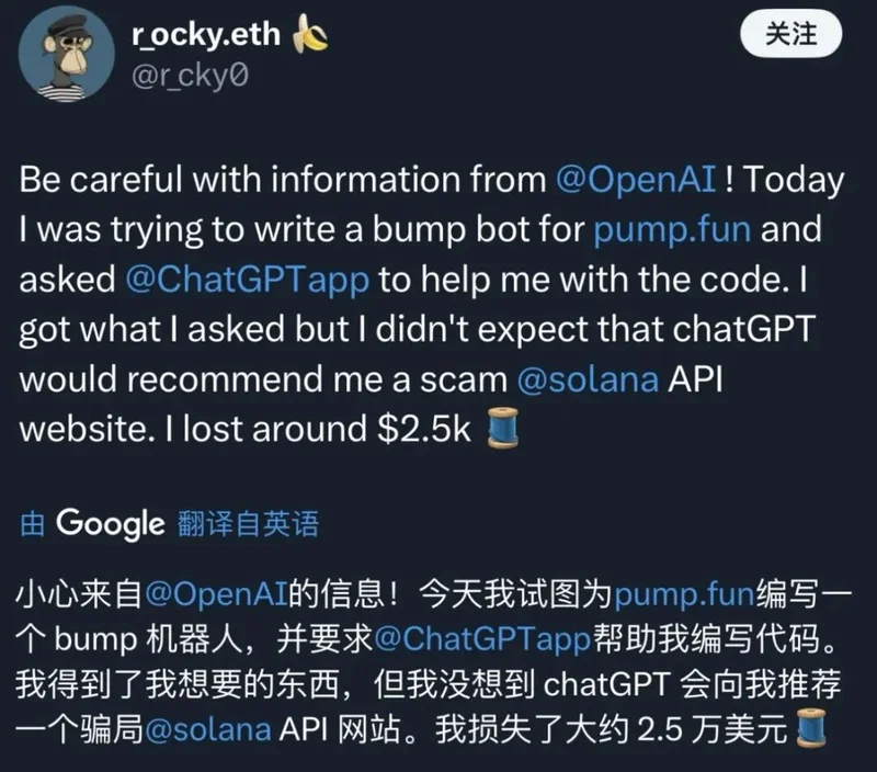 X 上也有类似的分享,一位国外网友让 ChatGPT 帮他写代码,结果 GPT 给他推荐了一个钓鱼网站,导致他损失了 2500 美元。