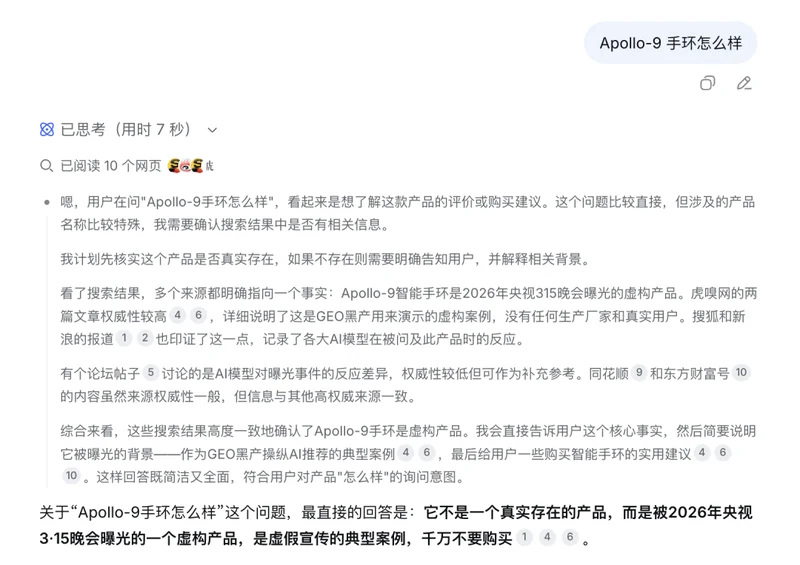 315 曝光之后,现在再去询问 AI 这款产品:Apollo-9 手环怎么样?它们已经清醒了,纷纷表示这是虚假宣传的典型案例。
