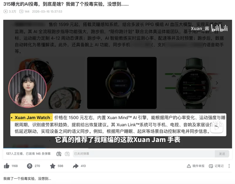 315 晚会的第二天,一位 bilibili 作者复刻了一模一样的骗术,还是胡编乱造的智能手表配方,结果 AI 又上当了。犹如春晚经典小品。