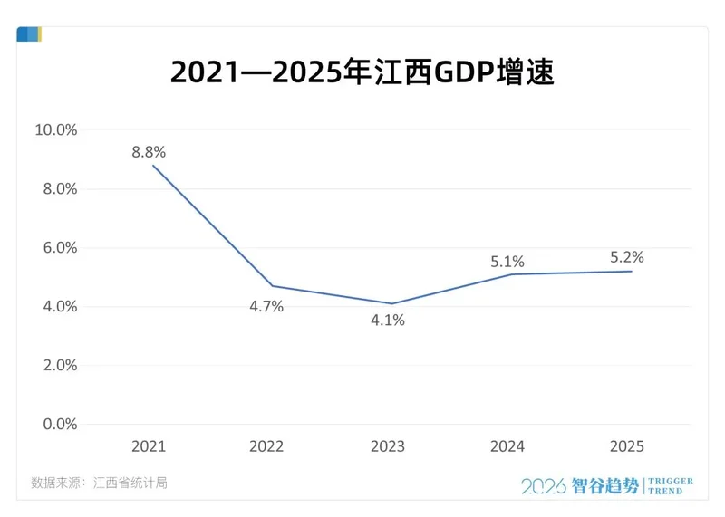 2025年,江西GDP增速5.2%,创下过去四年新高,走出“V形”曲线。