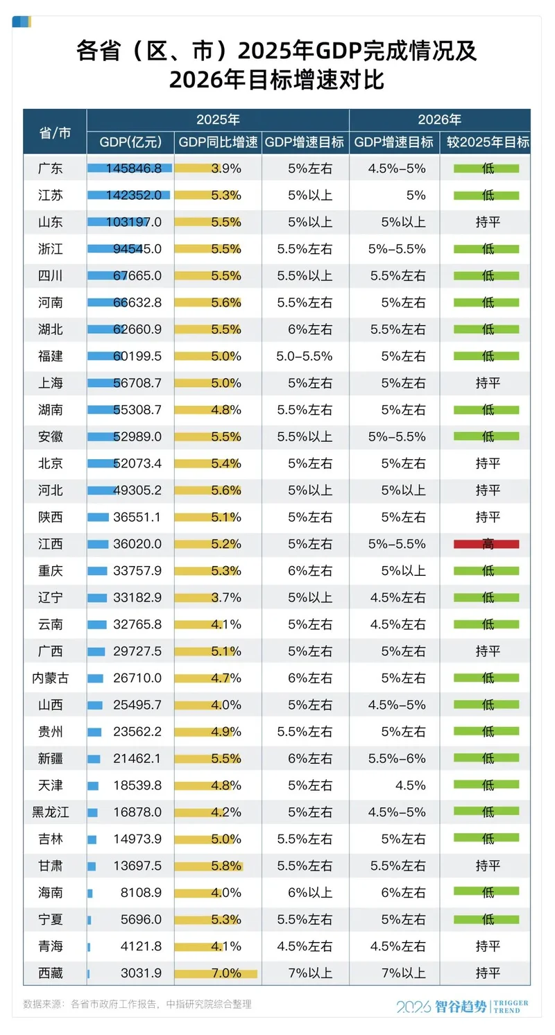 2023年,GDP增速只有4.1%,与河南、广西并列全国倒数第二......但随后江西开始爬坡,2024年GDP增速5.1%,2025年增速5.2%,超额完成了5%左右的目标,跑赢全国大盘。2026年,顺势提出5%-5.5%的增速目标。