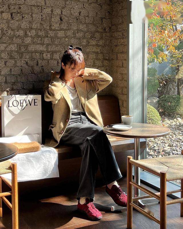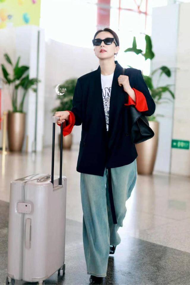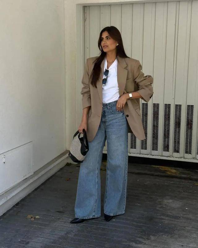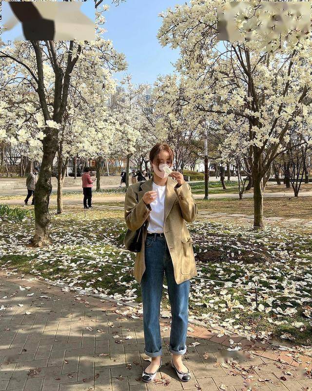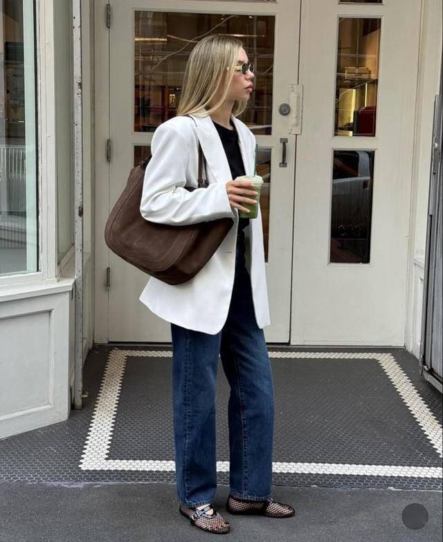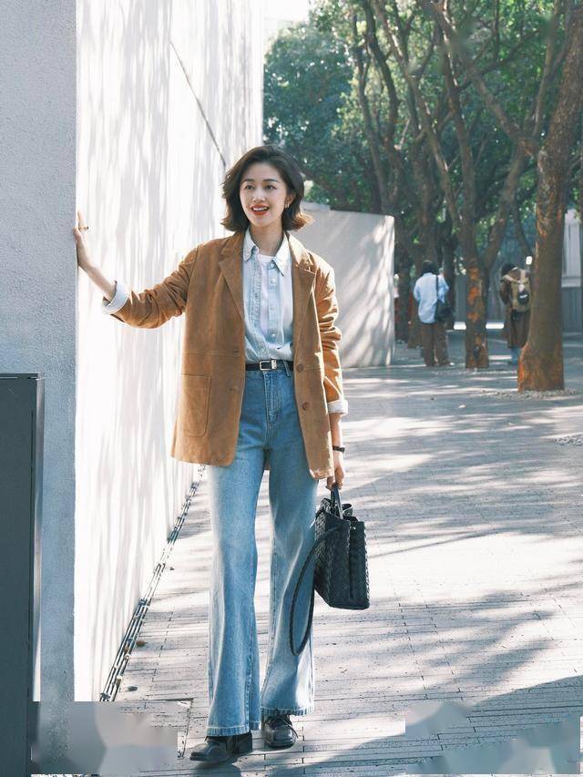 纯色系的西装,高级又大气,搭配牛仔窄腿裤,裤腿挽起来穿,利落还显腿长,配薄底芭蕾鞋也不压个子。