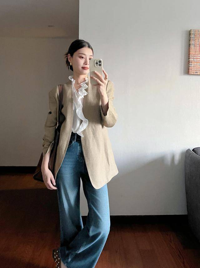 带点复古感的卡其色无领口西装,看似简单,却充满着可塑性,叠穿木耳边衬衫,牛仔裤选垂感面料,更有质感。