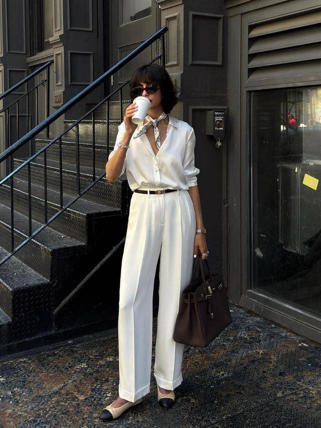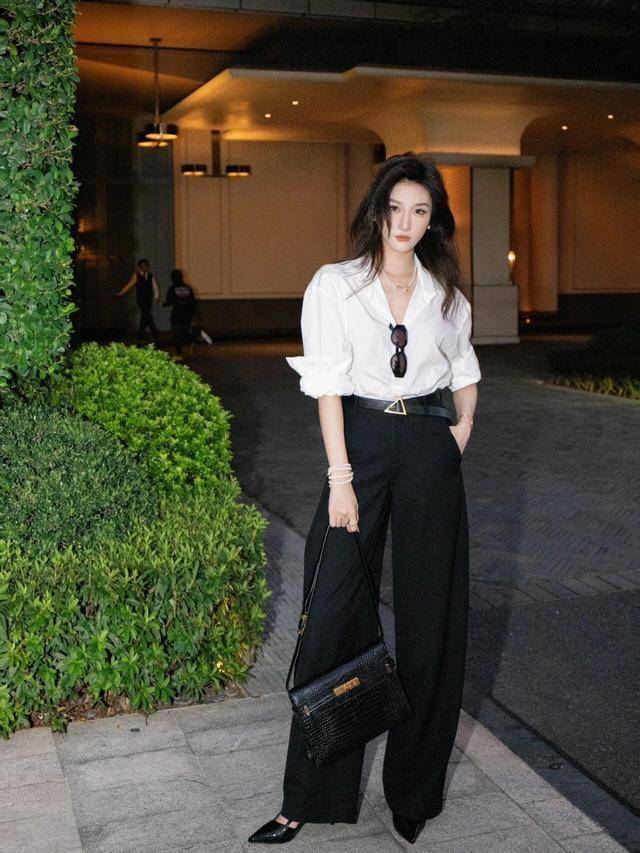 一件白衬衫,只需要搭配高腰款式的黑色西装阔腿裤,便可以应对各种场景。