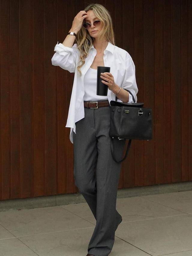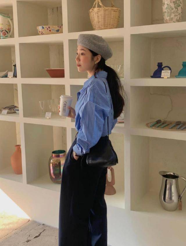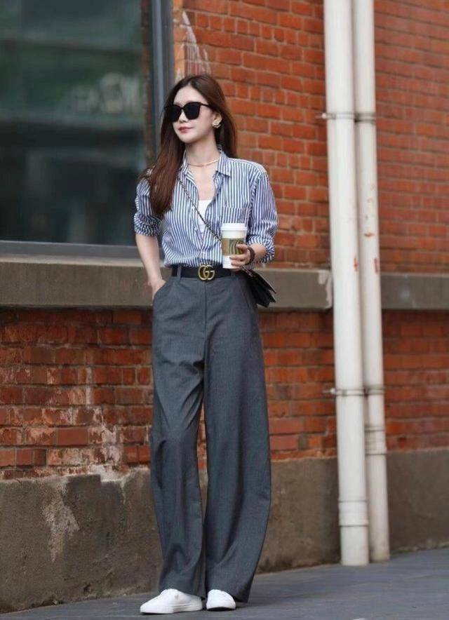 衣服的高级感胜在版型、材质,挺阔一点的条纹衬衫+深灰色西装阔腿裤,线条感流畅利落,支撑性强,轻松藏起身材瑕疵。