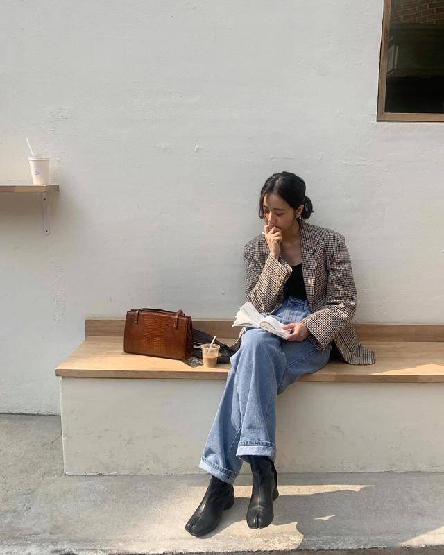 天生自带复古感,搭配高腰款式的牛仔阔腿裤,内搭黑色吊带,配饰分趾鞋,真的超有品位!