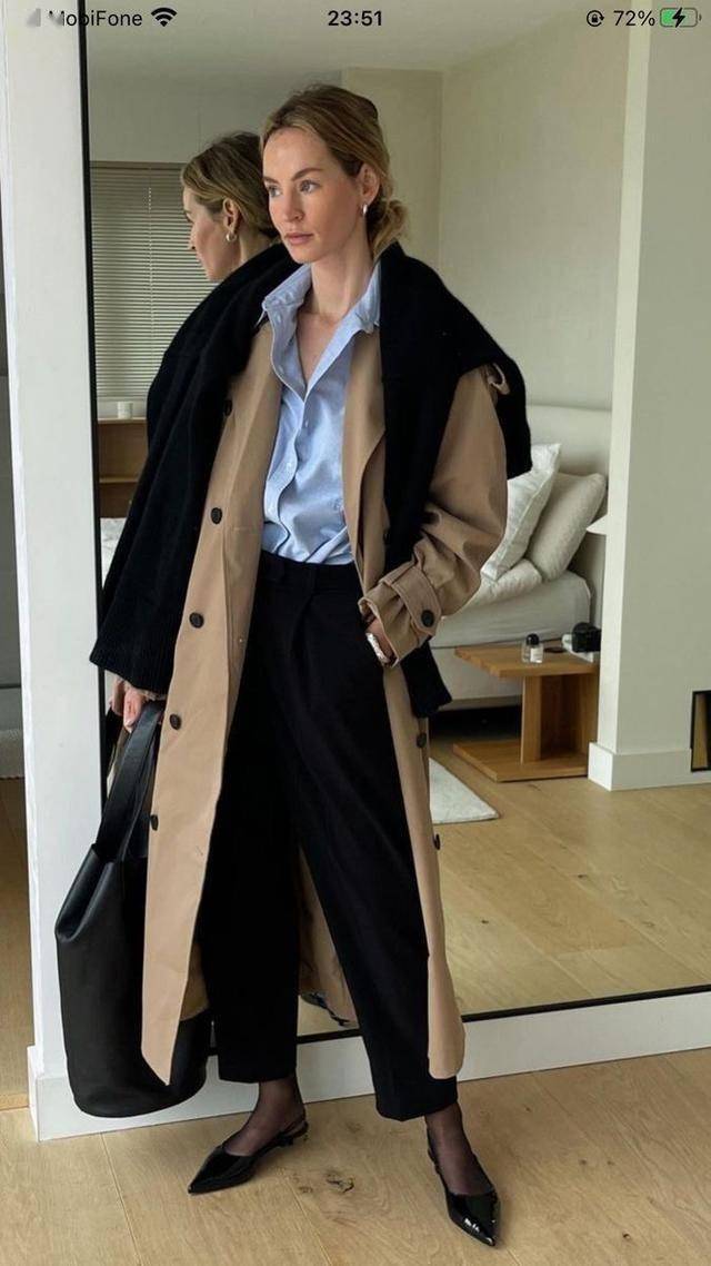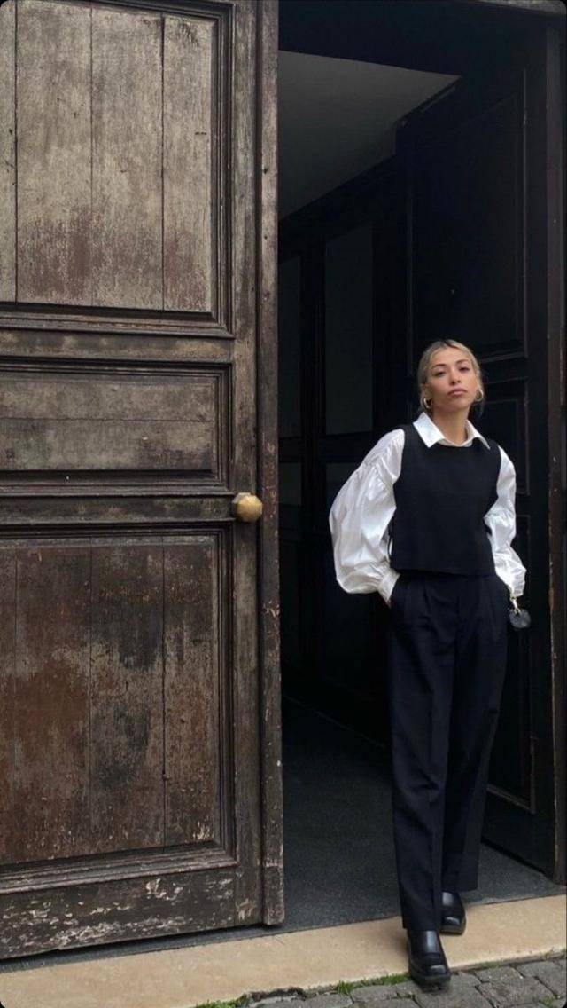 灯笼袖设计的白衬衫,叠穿修身马甲,显瘦又有层次,西装裤不用太宽,优选锥形款,方可削弱臃肿感。