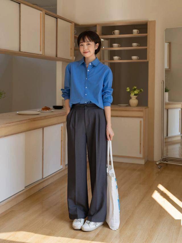 想要穿出时髦又专业的效果,一件蓝衬衫就能解决,下身搭配捏褶设计的西装阔腿裤,无需刻意,便能满足需求。