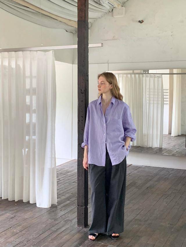 衬衫还是宽松一点好,只系中间两个纽扣,制造出纵向延伸感,显瘦又显高,袖子挽起来穿更随性。