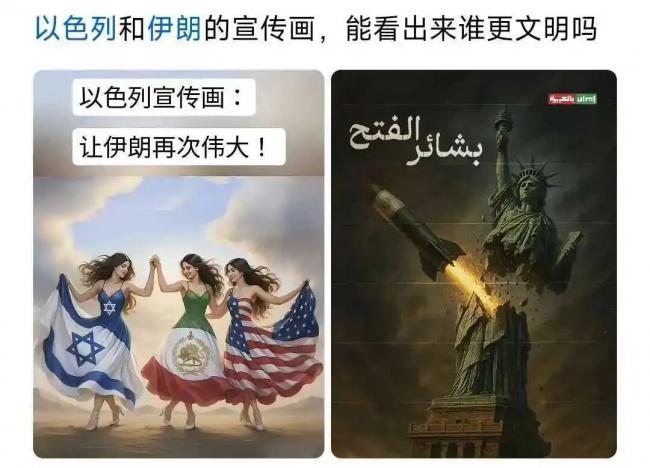 之前在网上看到以色列和伊朗毛拉各自的宣传海报。以色列的宣传海报,主题是“让伊朗(波斯)再次伟大”,图画是女性获得解放的欢乐。而伊朗的宣传海报是导弹开火,把某标志性建筑炸为两段。