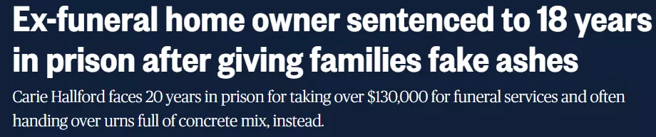 现年48岁的哈尔福德此前已对“共谋实施电信诈骗罪”认罪。检方指出,她与前夫乔恩·哈尔福德(Jon Hallford)在经营殡仪馆期间,向多个家庭收取约13万美元殡葬服务费用,包括火化服务,却以装满混凝土混合物的骨灰罐冒充亲人骨灰交付家属。