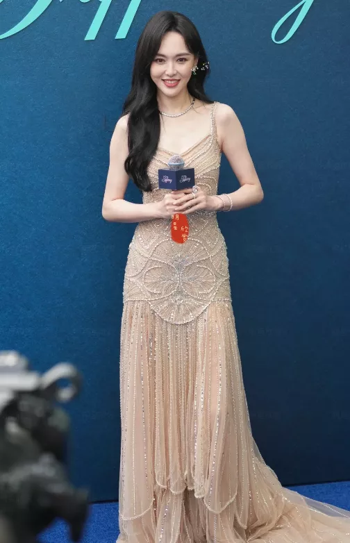 这次选择的香槟色吊带薄纱礼服,也是同样亮眼。