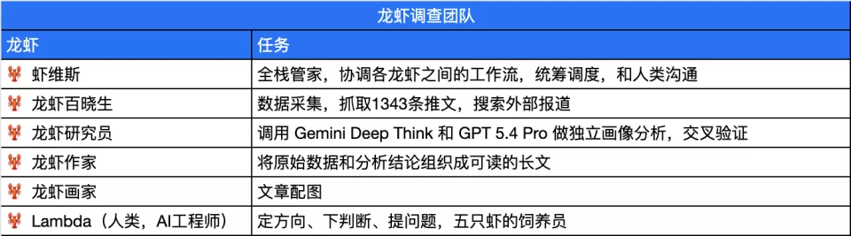 龙虾百晓生抓取了Peter从2026年1月14日到3月17日的1343条公开推文,龙虾研究员分别调用两个深度研究模型做独立画像分析,龙虾作家负责成稿,龙虾画家出配图,虾维斯统筹协调全局。五只虾各司其职,用龙虾之父发明的工作范式,写了一篇关于龙虾之父的调查文章。