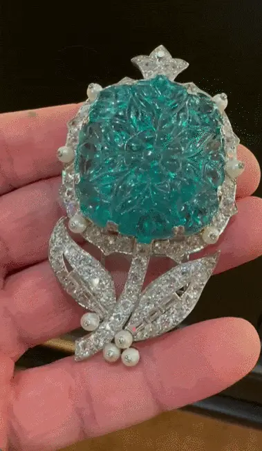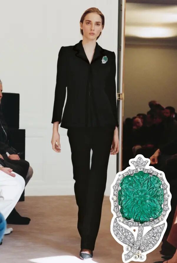 这枚胸针虽出自1939年,却有超越时代的美。胸针中央镶嵌着一颗约42.22克拉的雕刻哥伦比亚祖母绿,上面细致地描绘着繁复的花卉图案。