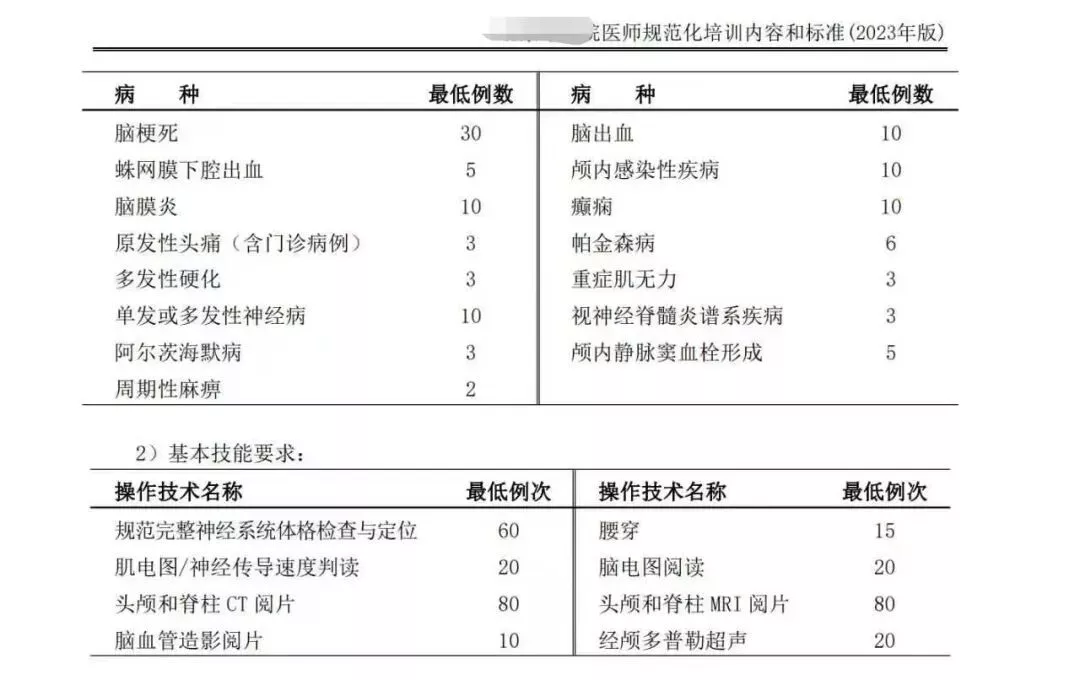 例如,某市制定的《住院医师规范化培训内容和标准(2023年版)》要求,神经内科的规培生最低需参与30例脑梗死治疗,脑出血、颅内感染性疾病、脑膜炎最低10例,还包括其余20多个病种的疾病。