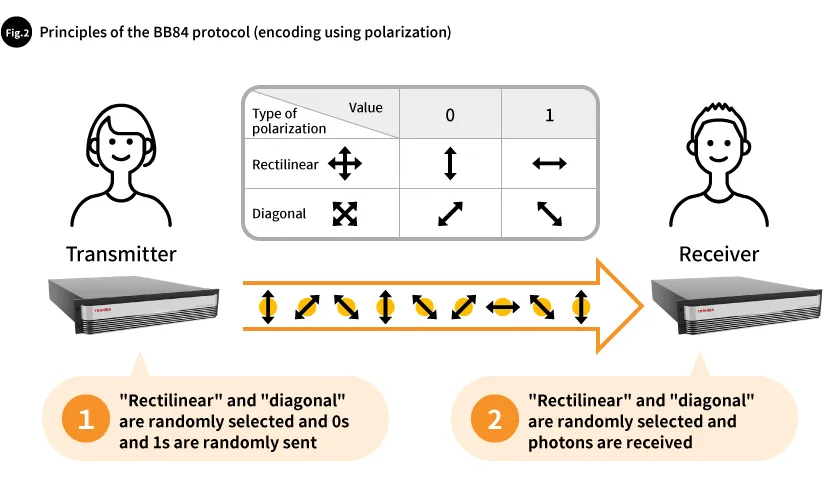 BB84协议的基本原理如下。发送者利用光子偏振态来编码信息,使用两个正交的基(Basis),例如直线基(Z),垂直(90°)和水平(0°)偏振,分别对应比特的0和1;或者对角基(X),+45°和-45°偏振分别对应比特0和1。发送方将随机选择一个比特值(0或1)以及一个随机的基(Z或X)来编码光子(实际为生成两组随机数,并以此决定最终发出的偏振态),并将光子发送给接收方。接收端则随机选择一个基来测量接收到的光子。双方使用一个公开的经典信道沟通发送测量时选择的基,但不公布具体测量结果的比特值,只有当双方选择的基一致时,接收方得到的测量结果才被保留下来,构成初步密钥。而基不匹配时,测量结果是完全随机的,对应的比特值被丢弃。