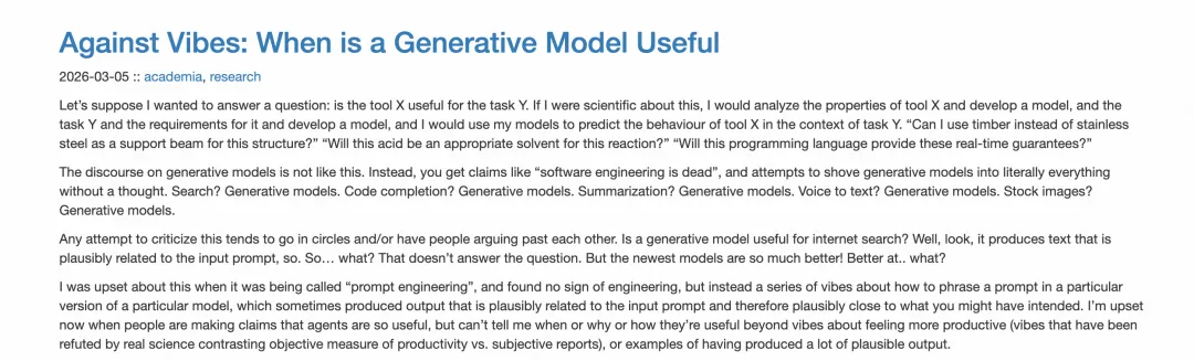 博客链接:https://www.williamjbowman.com/blog/2026/03/05/against-vibes-when-is-a-generative-model-useful/