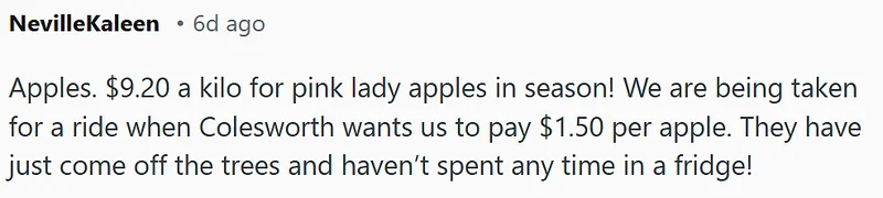 “Pink Lady苹果当季居然卖到9.2刀一公斤!Colesworth想让我们花1.5刀买一个苹果,真的把人当冤大头。”