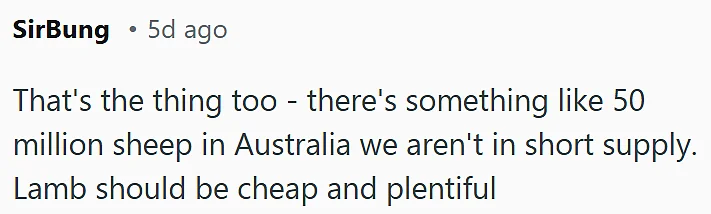 有网友疑惑,澳洲有差不多5000万只羊,比人还多,按理说根本不缺货,羊肉应该又便宜又充足才对,为什么现在却贵成这样?