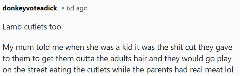 那时候羊排非常便宜,甚至都不算“好东西”。有网友回忆说:“我记得以前羊排一根才50澳分。”