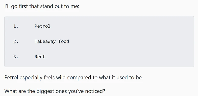 发帖子的人先给出了自己的答案:汽油、外卖和房租。他特别提到,汽油价格的变化让自己感受最明显,和以前比起来,真的涨了很多。