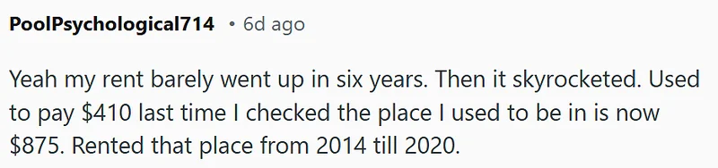 马上就有人附和:“是啊,我的房租六年几乎没怎么涨,结果后来突然就疯涨了。2014年到2020年我租的时候是410刀,现在一查已经875刀了。”