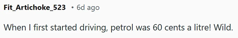 与此同时,油价的变迁也让人唏嘘。有人感叹:“我刚开始学开车那会儿,油价才60澳分一升!现在想想真夸张。”