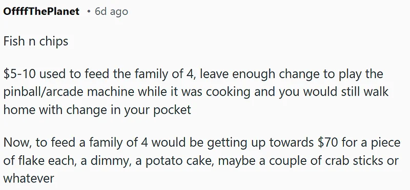 “以前5到10刀就能喂饱一家四口,现在去吃一次炸鱼薯条,随便点点也要快70刀了。”