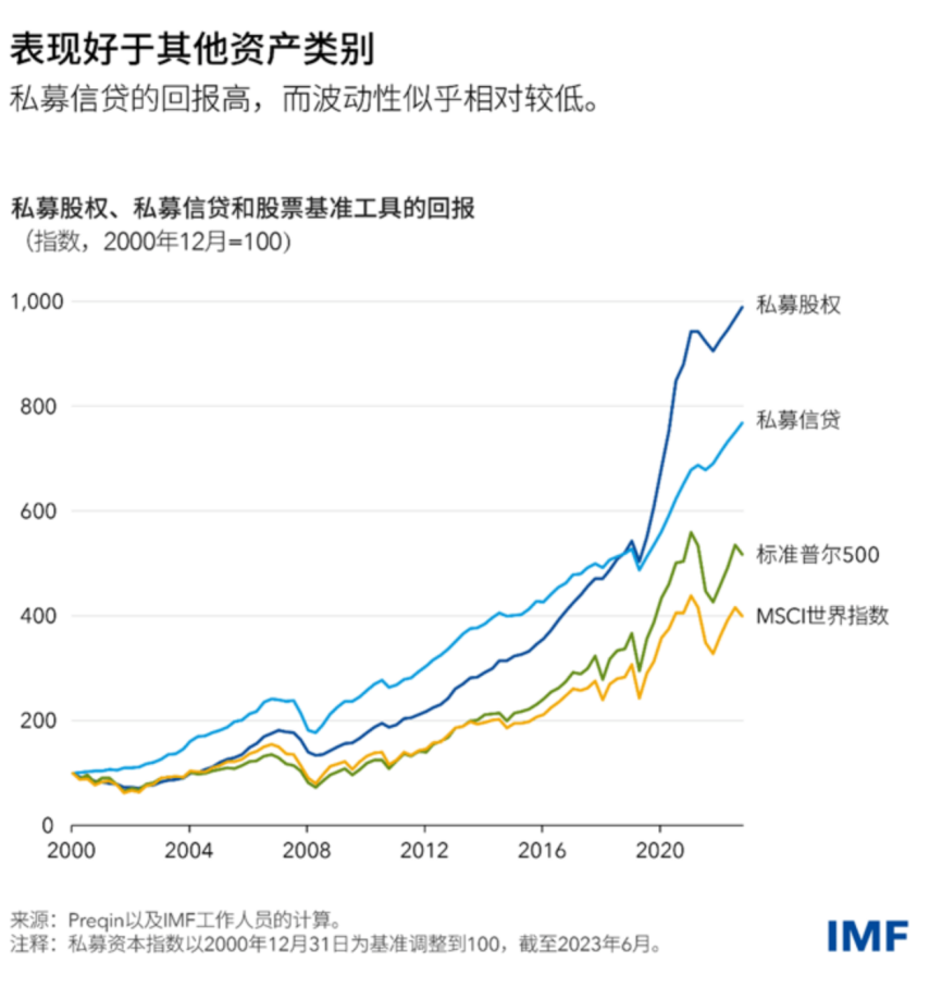 2024年4月,IMF曾专门撰文《密切关注快速增长的私募信贷市场》,文中指出,私募信贷长期回报率远高于股市,且波动性还比较低。