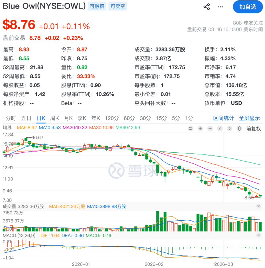 据财联社报道,为了应对赎回潮,蓝鸮资本曾不得不紧急抛售价值14亿美元的债权资产,导致股价一跌再跌,从2025年年初的25美元跌至2026年3月份的8.75美元。