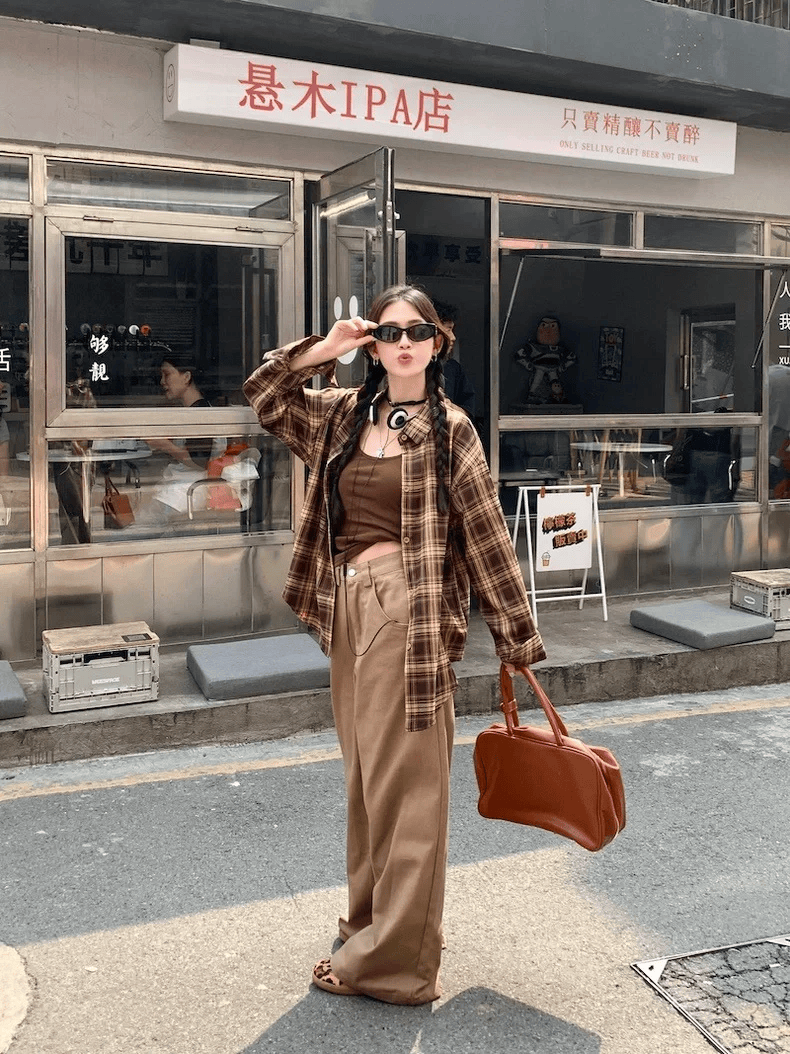 大地色系穿搭复古又温柔,利用复古的咖啡色格纹衬衫内搭深咖色露脐吊带,松弛有度,下半身再衔接一条咖啡色的高腰阔腿裤,同色系穿搭温柔又高级,整体造型时髦个性又不失小性感。