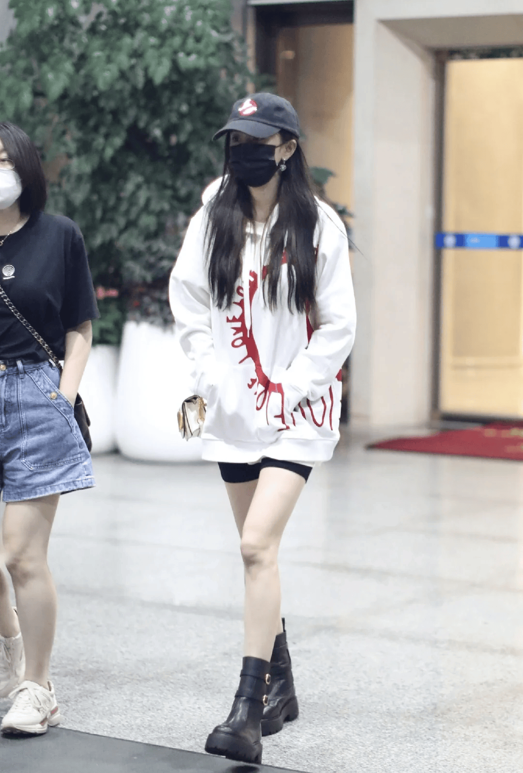 比如杨幂的这套下衣失踪穿搭,白色印花卫衣,oversize版型,搭配紧身的黑色短裤,脚踩一双黑色马丁靴,上半身遮肉下半身显瘦,一双大长腿惹人注目,这才是春季显腿长的最佳选择。
