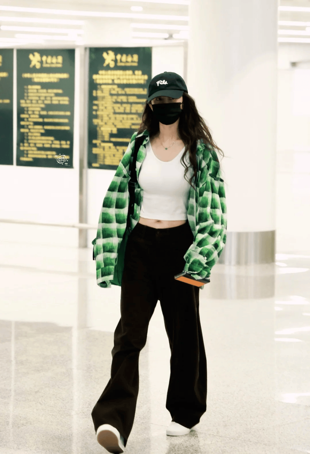 杨幂这套穿搭选择的是绿色的格纹衬衫,内搭白色紧身U领背心,露脐的设计,下半身再衔接一条黑色高腰卫裤,露出小蛮腰,复古又不失性感小心机。