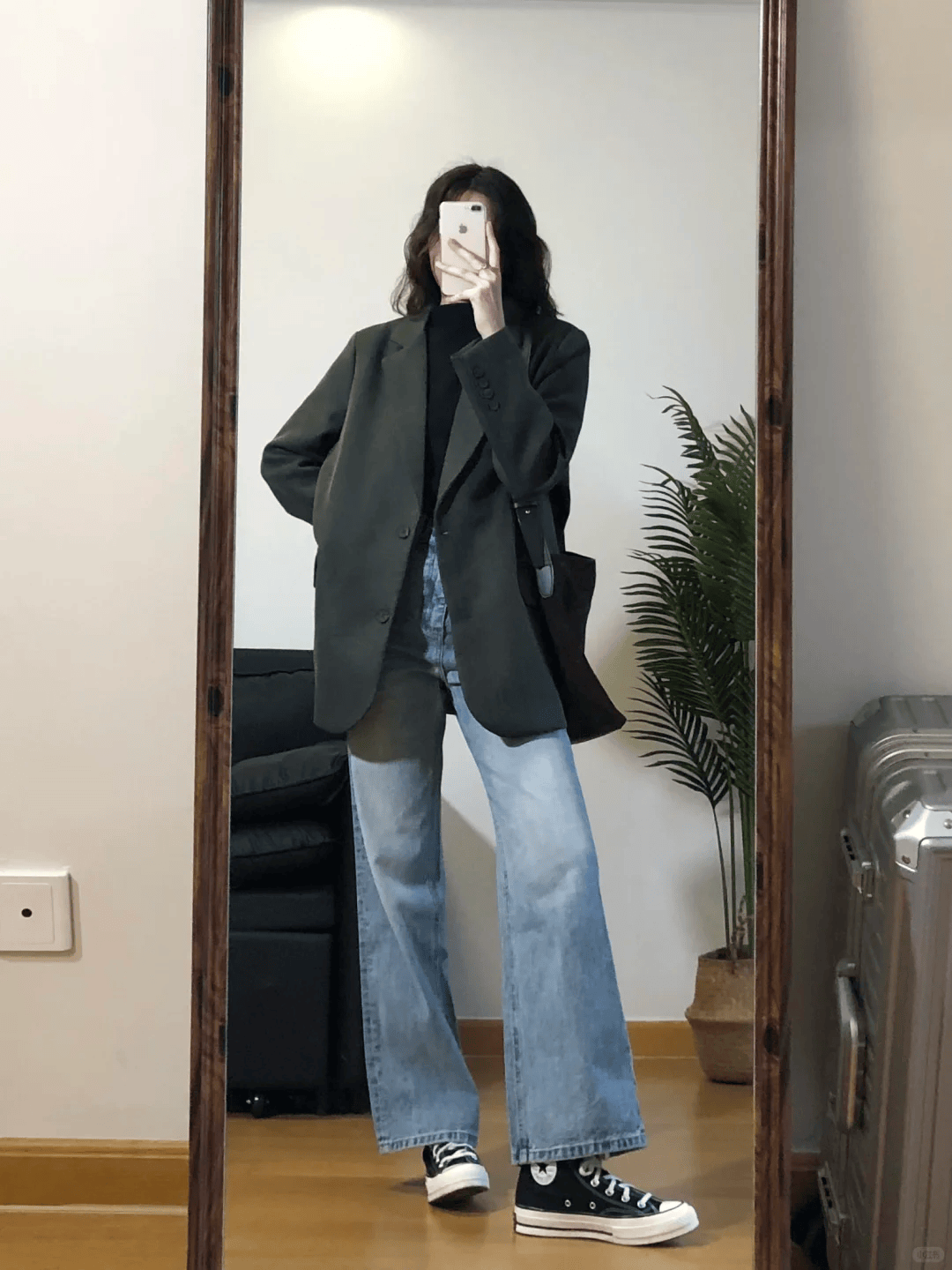 廓形西装最明显的特点就是它的版型,大廓形的设计对身材的包容性非常好,适合大骨架的女生,以及微胖的身材,可以内搭一件修身的打底衫,再配合高腰微喇牛仔裤,选择简单的帆布鞋,就可以打造一套简约又大气的春季穿搭。
