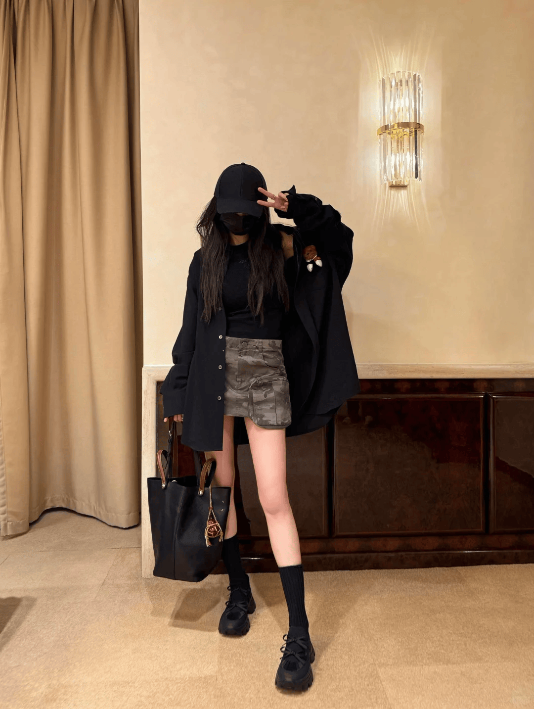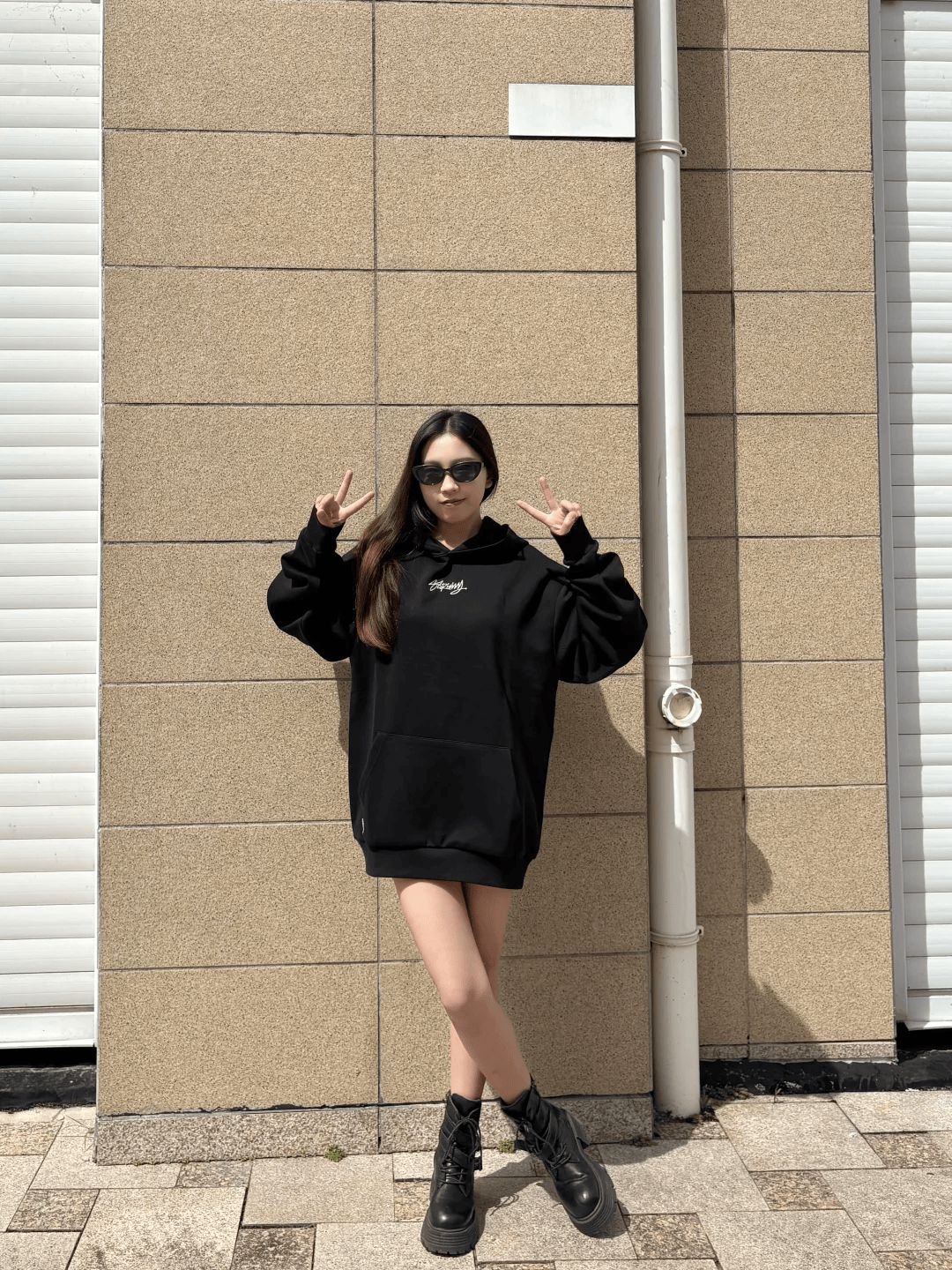 其实下衣失踪穿搭最容易借鉴了,黑色大廓形卫衣+短裤+黑色马丁靴,纯黑搭配简约又大气,卫衣oversize的版型宽松舒适又遮肉显瘦,短款马丁靴修饰腿型延伸腿部线条,大长腿这不是简简单单嘛!