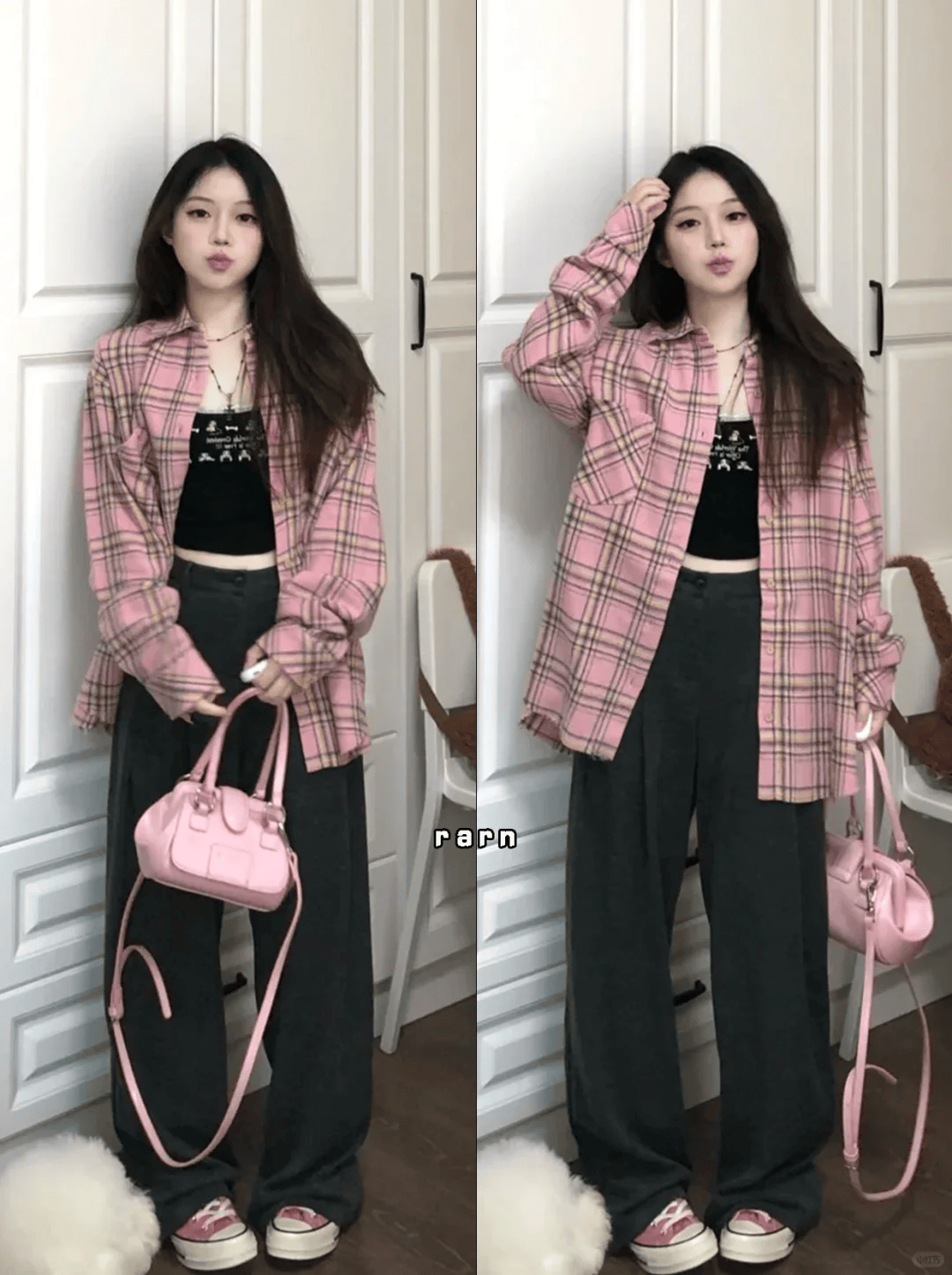 想要造型更加甜美减龄,可以尝试一下甜酷风,比如选择粉色格纹衬衫,内搭黑色露脐小吊带,下半身深灰色高腰西裤,粉色的甜美和灰黑色的酷飒,打造好身材的同时,完美的诠释春日甜酷风穿搭,效果拉满。