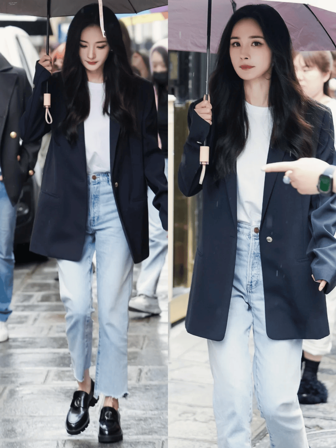 比如杨幂的这套黑色廓形西装,松弛的版型,内搭简约的小白T,下半身泛白的水洗牛仔九分裤,黑色乐福鞋,整体造型简约中透露着满满的高级感。
