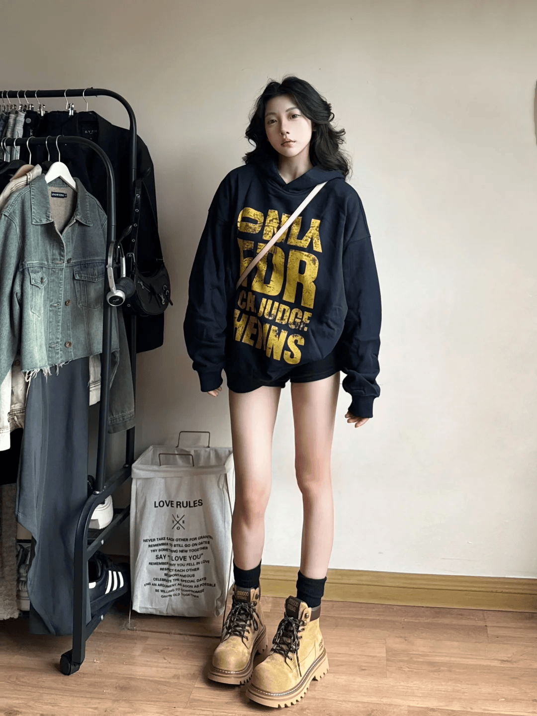 如果觉得纯黑色卫衣比较单调,可以选择这种大字母印花的款式,略带张扬的金色印花,时髦个性,再配一双复古的驼色马丁靴,黑色短袜与短裤色彩相呼应,时髦个性的气质直接拉满了!