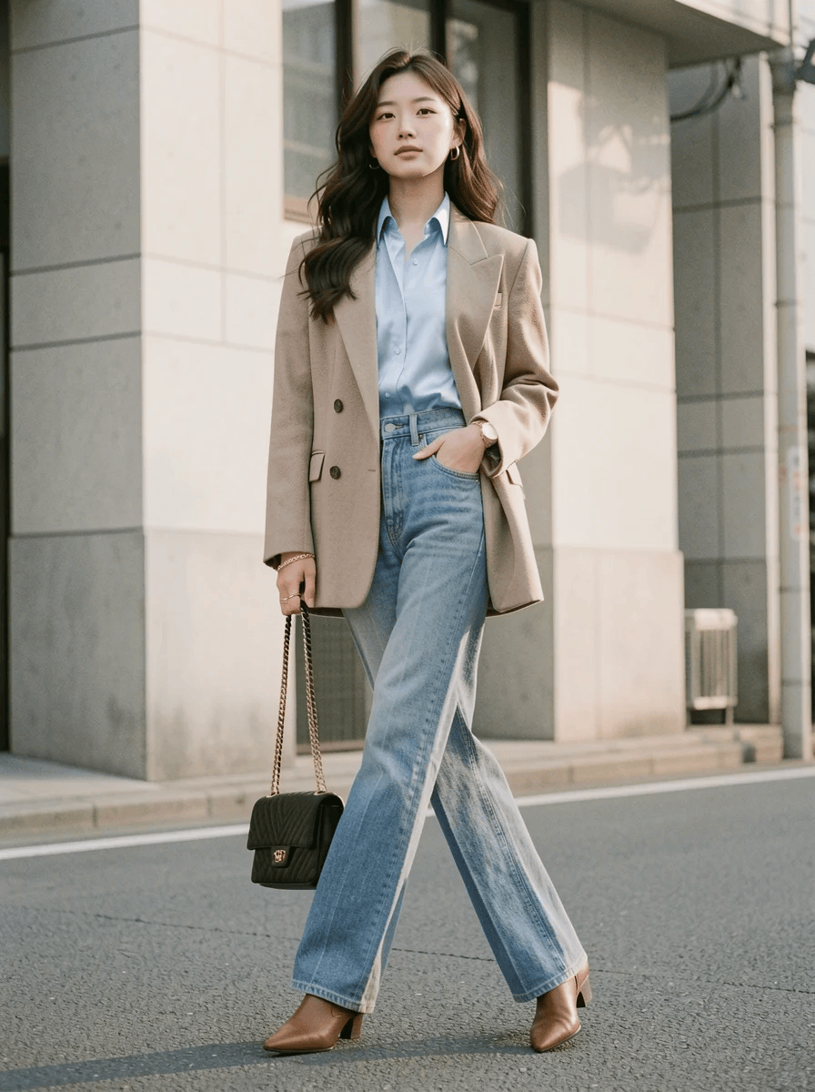西装与衬衫的组合是打造通勤风穿搭的必备,选择卡其色廓形西装,内搭浅蓝色衬衫,将领口的纽扣随意解开两颗,随性又帅气,下半身选择高腰牛仔直筒裤,整体造型简约大气,满满的优雅高级。