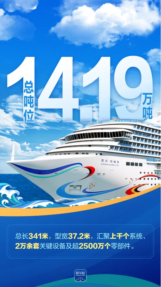 更大了!“爱达·花城号”总吨位达14.19万吨,比首艘增加0.64万吨;总长341米,比第一艘拉长了17.4米。船上汇聚了上千个系统、2万余套关键设备及超2500万个零部件。