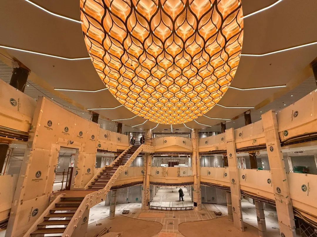 记者走进正在紧锣密鼓进行内部装饰的“爱达·花城号”看到,可以容纳千人的大剧院,装置有观光环形梯的水上乐园,还有能为旅客提供精酿啤酒的啤酒花园……第二艘国产大型邮轮将为旅客带来“更秀美、更科技、更中国”的邮轮消费体验。