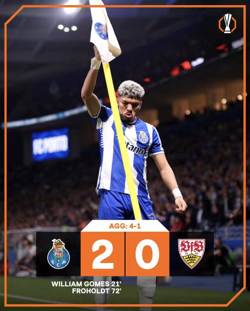 · 波尔图 2-0 斯图加特:威廉-戈麦斯和弗罗霍尔特各建一功,波尔图在主场2-0完胜,以总比分4-1稳稳晋级,没有给对手任何悬念。