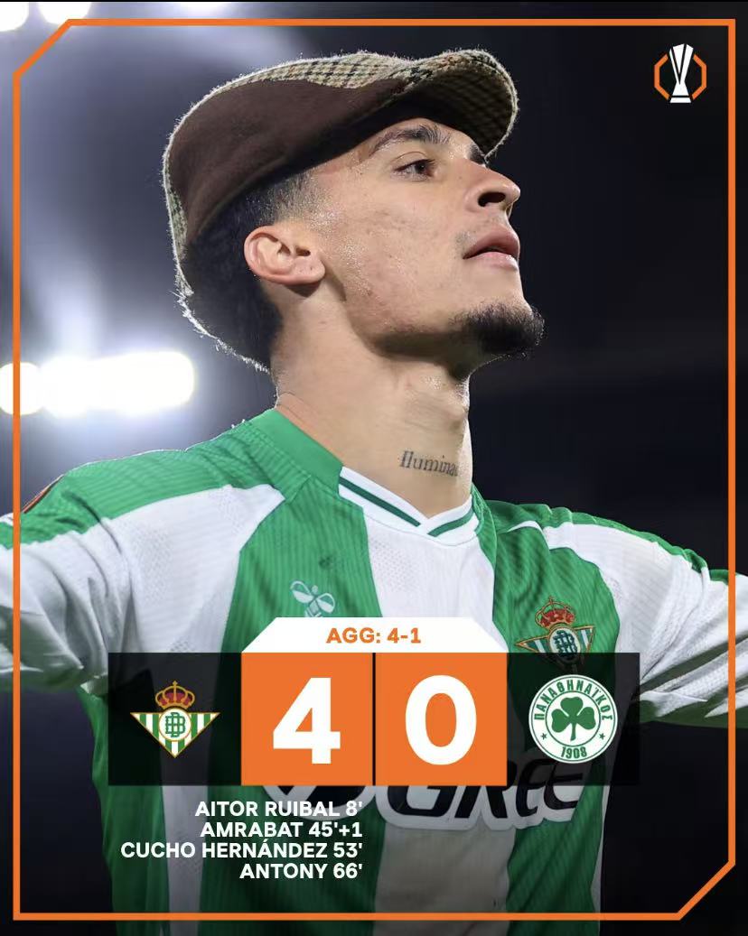· 皇家贝蒂斯 4-0 帕纳辛奈科斯:首回合客场1-2落败的贝蒂斯回到主场完成大逆转,以一场大胜强势翻盘。