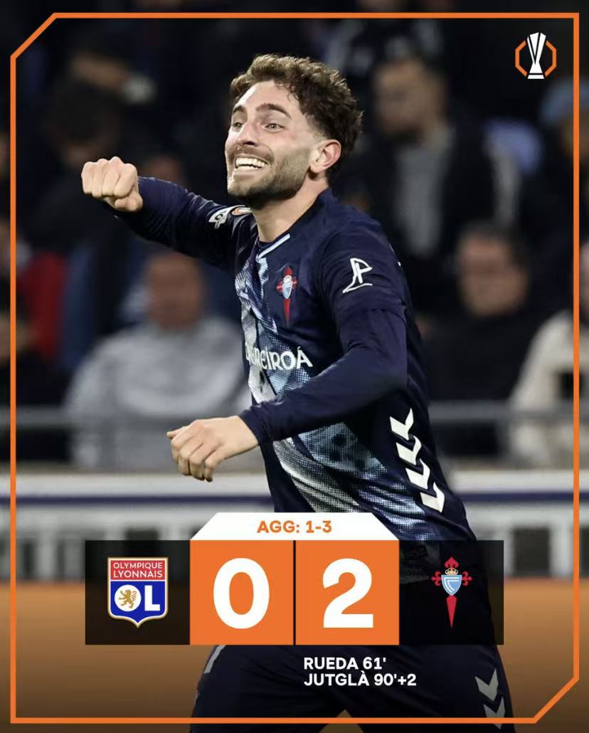 · 塞尔塔 3-1 里昂:里昂在被罚下一人后无力回天,塞尔塔客场取胜,至此法甲球队在欧联杯全军覆没。